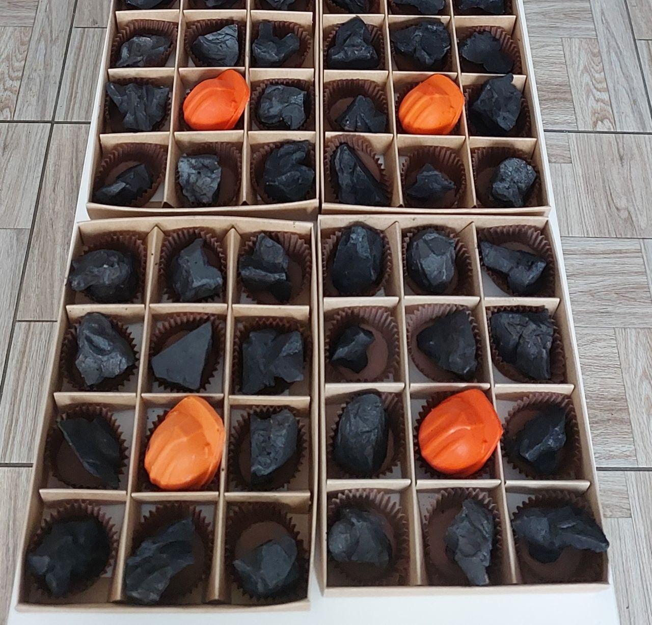 Корпусные конфеты в виде угля и каски с наполнением облепихи и шоколада